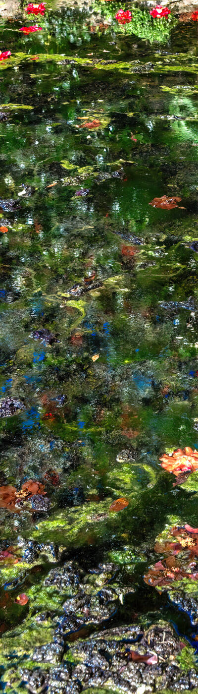 Ce n’est que la mise en perspective des marais du Morbihan ou de Normandie, d’un lac d’Auvergne ou d’une rivière du Finistère, par un emprunt libre à une pensée associant contemplation de la nature, apaisement des passions, recherche de la sérénité. Le taoïsme ayant infusé dans tout l’art d’Extrême-Orient, on trouvera des emprunts à des formes venus aussi bien du Japon que de la Chine, kakemono, paravent ou masques de Nô. Sans oublier la référence aux impressionnistes et à Claude Monet, lui aussi fasciné par l’art japonais.
