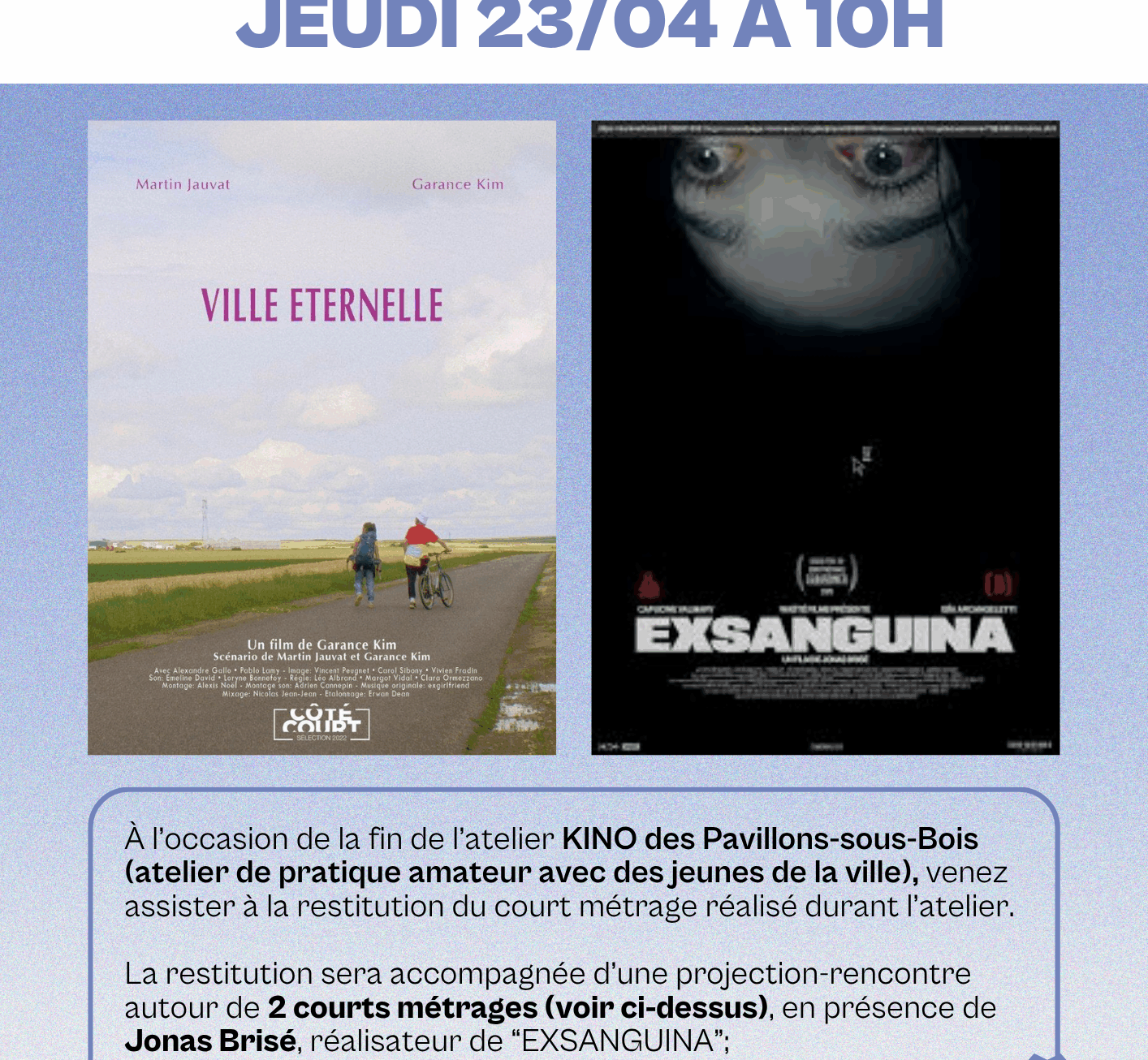 À l’occasion de la fin de l’atelier Kino des Pavillons sous-bois, encadré par les réalisatrices Nora ElHourchet Garance Kim, venez assister à la restitution du court métrage réalisé durant l’atelier. La restitution sera accompagnée d’une projection rencontre autour de 2 courts métrages.