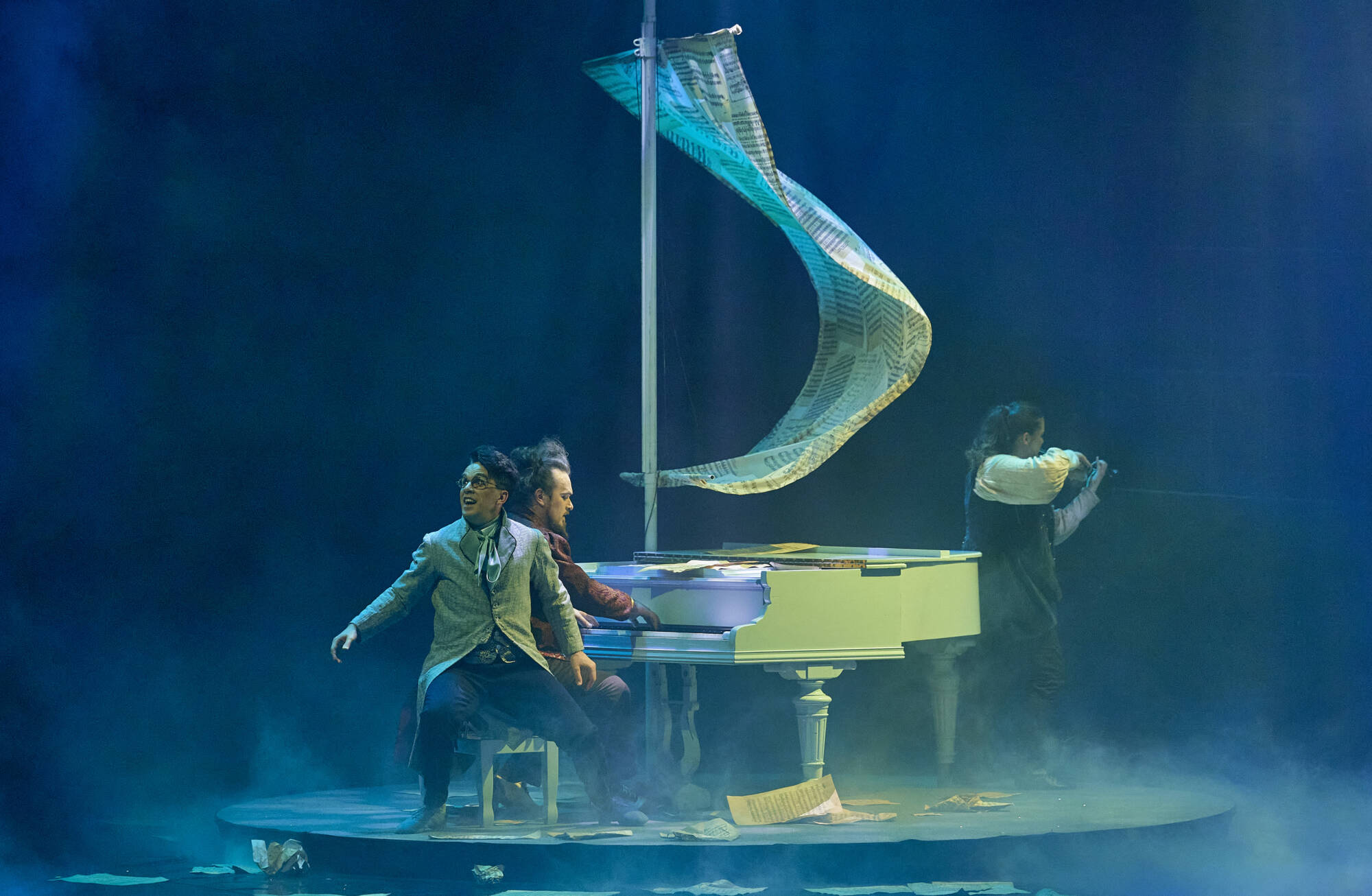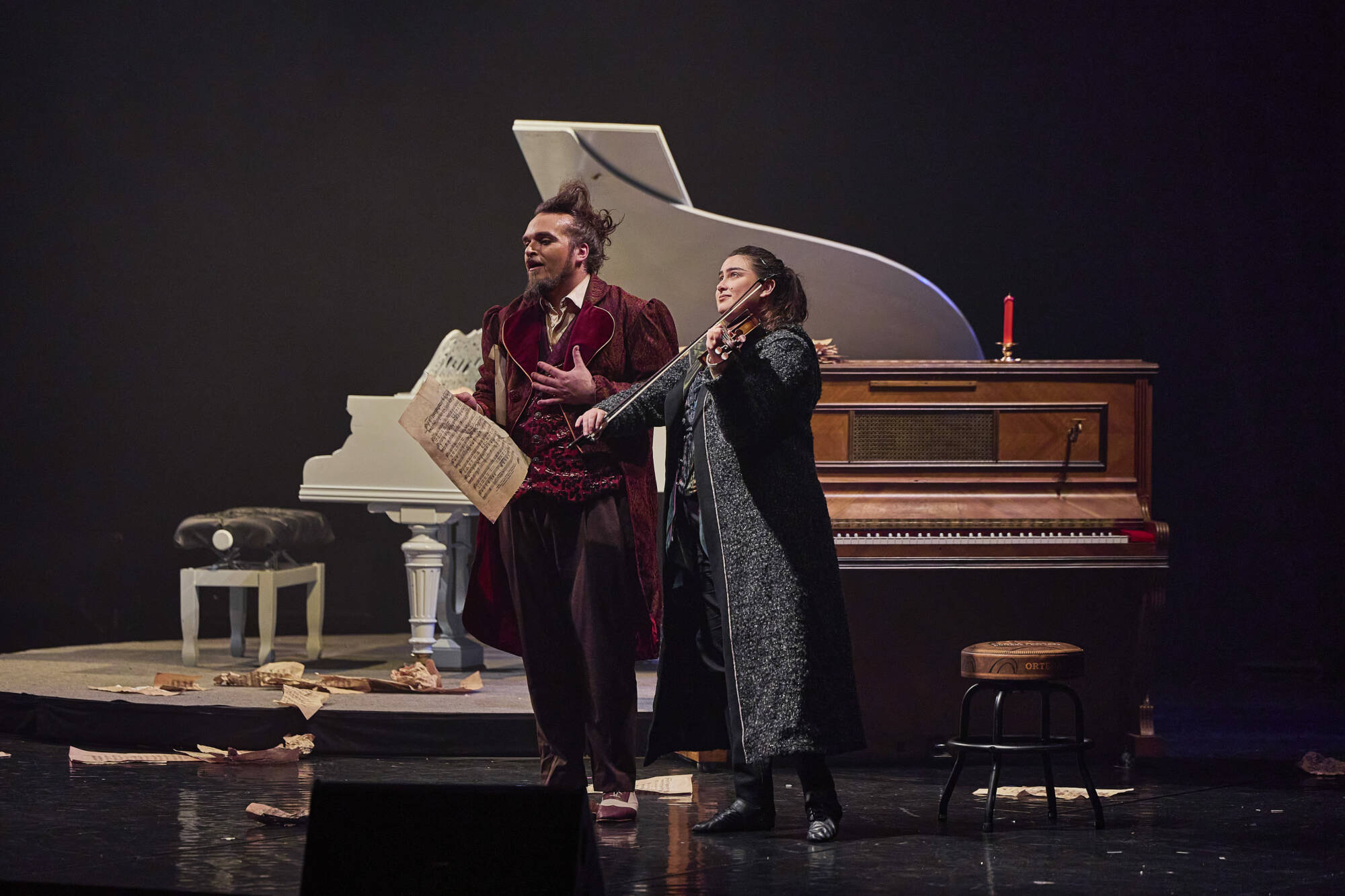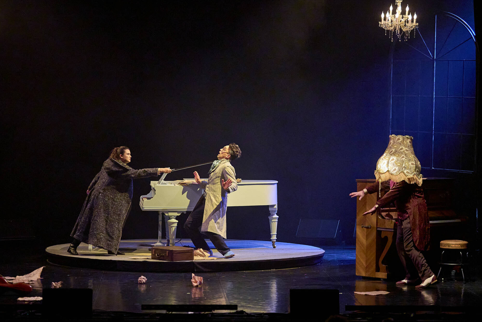 Alors qu’une tempête se prépare, deux pianistes se retrouvent face à une mystérieuse violoniste qui, contrainte de trouver refuge chez eux, bouleverse leur quotidien. L’étrangère souffle un vent nouveau, mettant à rude épreuve les deux compères qui rivalisent de virtuosité et de ruse pour dompter la vague qui s’annonce. Mais qui, des pianistes et de la violoniste, parviendra à imposer son tempo final ? Entre désaccords savoureux et instants de pure poésie, cet improbable trio nous emporte dans une folle épopée, aux confins de la musique et de l’imaginaire.